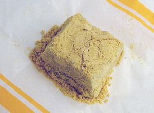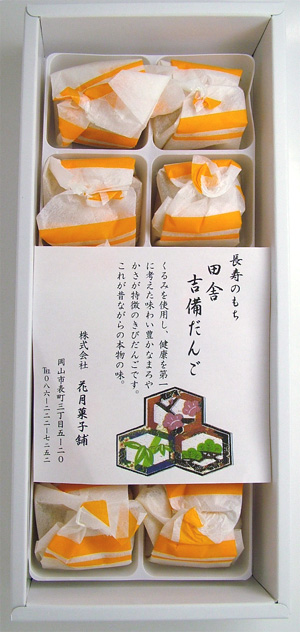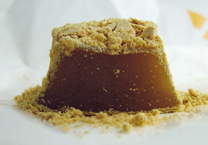 表町商店街3丁目(紙屋町)の老舗、花月菓子舗。個人商店と見せかけて、実は株式会社。岡山駅地下一番街にも出店している。 「きびだんご」と聞いて花月菓子舗を連想する人はほとんど居ないだろう。が、実はきなこ・餡入り・栗入り・チョコ入りと、4パターンものきびだんごを出しているのだ。 お店できびだんごを頼むと、奥の冷蔵庫から出してくれる。品質保持の為に冷蔵してあるのだ。これでは小売は難しそう・・・だが、逆に味に期待が持てる。 吉備路をイメージした包装紙はどのお菓子も共通。上に商品名シールが貼ってあるだけ。・・・このシール、インクジェットプリンターで打ってある。それもヘッドクリーニングしてないだろ?印刷荒れまくり。それでいいのか。 原材料表示も無い。中に入ってる挨拶文もプリンター出力。 うわーお、手作り感た〜っぷり。 やわらかさ:ムチムチ 甘さ:甘い 色:濃いきな粉色 香り:香ばしいきな粉の香り 袋を開けた瞬間、きな粉が香る。ひとつずつ風呂敷のように包まれたきびだんごは四角い(珍しい!)。きな粉はこぼれるほどに、たっぷり。 断面の色は濃い亜麻色。 ムッチリとした生地は味が濃く、黒蜜が練りこんであるみたい(原材料が不明なので分かんない)。わらび餅にも近いかも。プルンプルンとした食感が心地いい。 中にくるみの粒もいくらか入ってるのでコリコリとした食感も。 後口に少しくるみの渋みとアクを感じる。このコクはくるみのおかげなのかな。 「岡山銘菓」ではなく「美味しい和菓子」として成立するレベルの高さ。ボリュームがあるので1個で大満足。お家で食べるお菓子にも使えるなぁ。 かなりオススメ。美味しいです、ほんと。 ![]()
