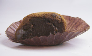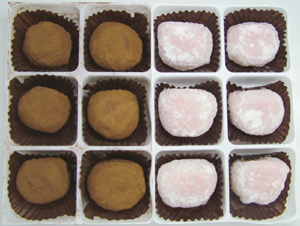 とても美味しいんだけど、「どこがきびだんご?」という商品を色々と出している花月菓子舗。この生チョコきびだんごは、岡山ではバレンタインデーに爆発的に売れているそうな。日持ちはしないし、要冷蔵。きびだんご界では珍しい、「県内消費が多いきびだんご」と言える。 岡山駅地下の一番街と、後楽園でのみ販売。表町3丁目の本店でも売っていないらしい。 レアなのが、この「いちご」。数量限定で、「工場が暇なとき」にしか作ってないそうな。年中売っている生チョコきびだんごには専用の箱があるんだけど、いちごは包装紙で誤魔化してある。またこの包装紙がサクマのイチゴミルクみたいで安っぽい。原材料シールは、生チョコの方のみ書いてあって、いちごには触れてない・・・いいんか、それで。 中の説明書きはまたしてもインクジェットプリンター。ステキだ・・・。 最高級のベルギーチョコレートと極上の生クリームを使った、超高級なきびだんごだと書いてある。見れば見るほど「きびだんご」には見えないなぁ・・・。 [チョコレート] やわらかさ:トロットロ 甘さ:甘い 色:濃い茶色 香り:カカオの香り 薄く求肥のような生地の周りにカカオがまぶしてある。中にぎっちりみっちりチョコガナッシュ。もち部分うすっ!ネットリとしたチョコが、ウッとするほどた〜っぷり。チョコと一緒になるともちの甘さを感じなくなるけど、単体で食べると結構甘い。多少カカオの苦味もあって普通に美味しい。 しかし・・・これを食べて「きびだんごだ」と思える人はいないだろうよ。 [いちご] やわらかさ:しっとりトロロン 甘さ:甘い 色:ピンク 香り:いちごポッキー 白いもちにピンクの餡が透けて見える。餡(というかいちごチョコ)はイチゴポッキーのチョコ部分をやわらかくして凝縮したかんじ。ホワイトチョコの独特のコクはしっかり感じます。ちなみにイチゴのつぶつぶは入ってません。ジャンクフード寄り。 ケーキを食べたような満足感がある。