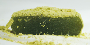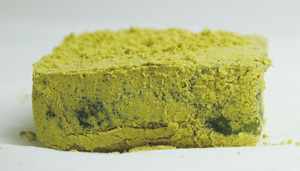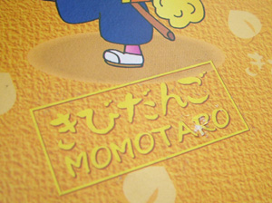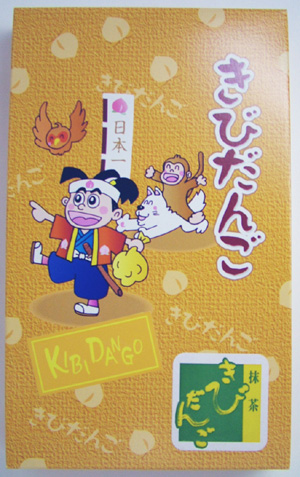 パッケージは「くるみ入り」と全く同じ。シールを貼って区別している。原材料表示まで共有しているぞ(くるみも抹茶も、両方一緒に書いてある)。 作り方はきな粉の方と同じ、型に流し込み系。 やわらかさ:しっかり重い歯ごたえ 甘さ:甘さ控えめ 色:濃い抹茶。きな粉を完全に落として広げるとわりと鮮やかな緑 香り:きな粉のなかにほのかな抹茶 “抹茶”と銘打つだけあって、まわりのきな粉にも抹茶をブレンドしているらしい。おかげで色が変色して見えるよ…また生地の色もキョーレツ!たしかに抹茶だよ、認める、認めるからさぁ…その藻のような色は……。 へなちょこ抹茶味製品が多い中、この抹茶味は一本芯が通ってる。噛むこどに抹茶の味が広がります。抹茶味が好きな人間にはオススメしますが、一般的には評価が分かれるところか。苦味が強いので子どもさんには不向きかも。 「くるみ入り」もそうなんだけど、パッケージ桃太郎の足元に「KIBIDANGO」というシールが貼ってある。こういう意味のないシールは何かを隠している可能性が。 という事で、めくってみた↓ ![]() ご丁寧に裏の透けないシール(粘着面が銀色のやつ)の下から出てきた文字は「きびだんごMOMOTARO」。 実は菓子メーカーの「銀装」が「日本一桃太郎」を商標登録しちゃってるのだ。それで以前、「桃太郎のきびだんご(中山昇陽堂)」という商品が商標権の侵害に当たるかどうかで訴訟問題になったのです。 結局、「桃太郎は一般名詞であり標識としての機能は無い」となり、商標権の侵害には当たらないと言う判決で落ち着いたのですが・・・それ以後、「桃太郎」をパッケージに記載するのはタブーとなったのでした・・・。 慌てた金萬堂さんはシールを貼ってごまかす事にしたのね。岡山きぴだんご界の大事件、2004年3月26日の事でした…って、金萬堂さん、早くパッケージ刷り直せよ!!