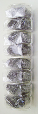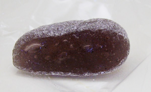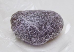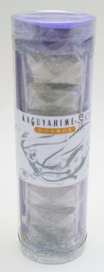 ブルーベリー+藍 うるおい鮮やか。甦るスイーツ。 最近流行のブルーベリー。活性酸素を除去する、つまり老化防止の効果があると大評判。私も疲れ目に良いと聞いてからけっこう食べてます。 藍はポリフェノールが豊富。つまり血液サラサラになるわけですな。 このきびだんごは、「KAGUYAHIMEの泉」の中でも一番、健康志向が強い気がするね。 やわらかさ:むっちり 甘さ:甘さひかえめ 色:暗い赤紫 香り:ほとんど無し ブルーベリーの香り、味はほとんど無し。藍って食べた事はないけど、特に変わった味もしない。普通の甘いゼリー菓子を食べているような感覚。 見た目はけっこう濃いのに、こんなプレーンな味なのは不思議な感じ。やっぱ世の中の「ブルーベリー味」は、添加物ゲトゲトなのかな。 ↑新発売を記念して、「2個以上お買い上げの方に記念品贈呈」というのをしていました。クリアファイルに銀の箔押し。 うーん、これはレアアイテムだ。もったいなくて使えない。