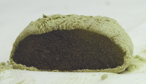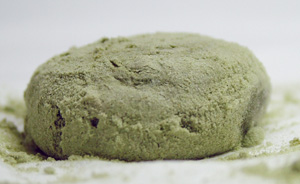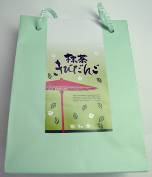薄緑色の小さな手提げバッグが可愛らしい。抹茶味で和風なので、もしかしたら外国人旅行者もターゲットにしているのか?英語の説明が書いてある。 Millet dumplings representing the legend of a heroic Kid,Momotaro,have been made heartily and been popular for centuries. Try one! (ポピュラーpopularの綴りが間違ってて、populorになってたぞ) Yahoo翻訳 英雄的なKid,Momotaro,haveの伝説を代表しているミレーゆで団子心から作られて、そして、何世紀もの間人気がある。1をためしてください! 「ミレーゆで団子」!!笑う。Milletは雑穀って意味だけど、人名で訳したのね。 Excite翻訳 英雄のKidに関する伝説の代理をするきび団子(Momotaro)は、心から作られていて、何世紀もの間、ポピュラーです。 1を試みてください! 「きびだんご」と訳せてるのは立派だけど、これじゃ「きびだんご=桃太郎」って意味になるね。外人さんがきびだんごを買って「It's Momotaro!」って言うてまうがな。 OCN翻訳 英雄的な子供(Momotaro)の伝説を表わすミレーのゆで団子は心から作られ、何世紀もポピュラーでした。1つ試みてください! 「ミレーのゆで団子」だけど、一番ちゃんとした訳かも。 やわらかさ:もちもち 甘さ:そこそこ甘い 色:抹茶色 香り:いぐさの香り(汗) これはまた、抹茶にしては白っぽい色ですねぇ。まぁ抹茶味だからといって異様に緑なのもウソっぽいからねぇ…なんだろこの色(汗) 全部抹茶だと苦くて食べられないから、この粉は何か混ざり物があるよね。きな粉かと思ったら原材料に無い。なに?なにこれ。餅粉? さてお味のほうは………これはまた…… 家の和室で香る…た○みの…あぅ(汗) あ、原材料確認して納得。クロレラの味だ。抹茶味というより、色付けのために投入したと思われるクロレラの味のほうが勝ってる… そうか、クロレラか…ま、まぁ健康の為ということにしておこう。 クロレラ食べた事ない人へ。あんまり生臭くない青汁だと思ってくだされ。抹茶あめ食べながら青汁飲んだ味。香りはいぐさ。おぉ、和風〜(?)。