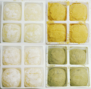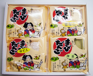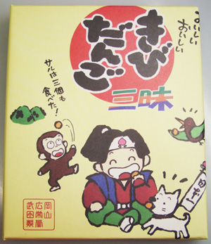 岡山市中納言に廣榮堂と並んで店を構える広栄堂武田。観光客に「どっちが本物やねん」と突っ込まれることも多いらしい。 ちなみにどっちも経営者は武田さん。いろいろ大人の事情がありそう・・・。 ---------------------------------------------------- 「広栄堂武田と廣榮堂の謎」 「広栄堂武田」と「廣榮堂本店」は元々は同じ「広栄堂」という和菓子屋さん。 昭和三十年代前半に「廣榮堂本店」が新しい会社を起こして独立、先に会社組織(法人)となる。遅れて「広栄堂」も会社組織にするが、商法の関係で広栄堂が登記できず「広栄堂武田」を屋号に。 創業者は同じご先祖さま(きびだんごの父:武田半蔵)なので、両方とも「安政三年創業」という事にはなる。 が、明治年間に武田浅次郎(きびだんごを全国的に広めた人物)が特許庁に出願した登録商標は「広栄堂武田」が所有している。 ---------------------------------------------------- さてさて、このきびだんご。4種類の味が一度に楽しめるセット。パッケージはコミカルで、かなり漫画っぽい。包装紙には「サルが欲張って3個も食べたので犬の怒りを買い、犬猿の仲となった」と書かれている。ほんとかなぁ・・・。 中のパッケージは全て同じで、味ごとにシールが貼ってある。 [プレーン]------------------------- やわらかさ:もっちり、密度しっかり 甘さ:甘くない 色:黄灰色 香り:なし 味は薄く、甘みも薄い。粘りが少なくサクっとしており、歯にくっつかない。 [ゆず入り]--------------------------- やわらかさ:もちもち 甘さ:甘さひかえめ 色:少し黄色 香り:ほのかにゆず ぽんかん飴の味。オブラートの味までするような気が・・・。粉が多すぎか。 [きなこ]--------------------------- やわらかさ:もっちり 甘さ:甘い 色:きなこ色 香り:きなこの香り きなこ自身の甘みは少ないが、食べているうちにだんだん甘くなってくる。きなこがモソモソって感じ。 [抹茶]--------------------------- やわらかさ:むっちり 甘さ:甘い 色:抹茶色 香り:なぜかコンブっぽい香り 抹茶ときなこが混ぜてあるのか、粉が多い。生地にも抹茶が練りこんである。味は100円ショップに売ってる抹茶飴っぽい。山口のういろうにも近いかな。なんとなくコンブ味がするのは何故だろう?