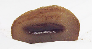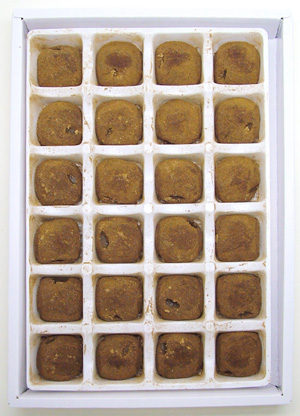 ガンダムファンなら誰でも知ってる久米町道の駅で購入(お土産でいただいた)。パッケージには「道の駅 久米の里」とシールが貼ってある。レアものじゃ〜。 パッケージはチーズとの色違い。背景の模様などは和風に振ってあるんだろうけど、デザイン自体はPOPな風合いで、微妙なアンバランスさがある。 生チョコと和菓子の融合なので・・・これもアリなのか? やわらかさ:さっくり 甘さ:甘さひかえめ 色:茶色 香り:ココア しかし、形成がまずいのか、へそ、へそ、へその連続。全ての団子に大小さまざまな凹みがついております。 長い生地をチョキンチョキン切った跡?うまくまとまってないな〜 生地自体にチョコが練りこんであるわけではなく、プレーンと同じ。凹の部分に地の色が白く見えてて、これがまた作りの雑さを際立たせている。 香りは、ココアなんだけど、純粋にココアだけの香りじゃない気が。ビニールの香りが移っちゃってるのかな…。 味の方のファーストインプレッションはシガレットチョコの包み紙の味!?表現しきれないけれど、鼻に抜ける香りがそんな感じ。 で、割と固めの餅の中にはちゃんとチョコクリームが。でもこの味がまた、安いコルネパンのチョコクリームの味。駄菓子、として考えるならバランス取れてるっちゃそうなんだけど… マズイわけでは・・・マズイわけではない。和菓子だと思うから躊躇してしまうのだ。 これは駄菓子だ、そうに違いない。