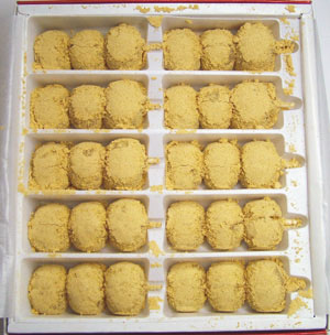 「本酒むし小福まんじゅう」など、かなりイケてるお菓子を作る「浦志満本舗」。観光土産と言うより、贈答用お菓子を作ってるってイメージ。 ここで売られているきびだんごは、小さなだんごが3本串に刺さって、きなこがまぶしてある「串だんご」。 味は一種類で、6本入り(315円)、10本入り(525円)、21本入り(1050円)、42本入り(2100円)・・・と、数量のバリエーションのみ。賞味期間1週間で短め。 パッケージが恐い!! 美少年のイメージがある桃太郎だが、これは白塗りの熊五郎!! 眉毛は太いしタラコ唇だし、ざんばら髪でクマドリ付けて襲ってくる! 怯えて逃げる赤鬼…どう見ても桃太郎の方が悪者だぞ。 子どものお土産には厳しいなぁ…。 やわらかさ:もちもち 甘さ:甘い 色:きな粉色 香り:香ばしいきな粉の香り これは美味しい。わお、マジでオススメ。 きな粉がとても香り高く、大豆の味がしっかり感じられる(岡山産の大豆を使っているのもポイント高い。 生地は甘く、求肥を食べているよう。きな粉と合うとコクが増し、上等な和菓子となる。 完全にきな粉を落として団子だけ食べたら、そこまでの味ではなかった。分析するに、きな粉の質の良さで全体的なレベルを上げているようだ。「きびだんご」としてのジャンルの中では、かなり上位に入っているはず。 岡山駅ピーチプラザ、岡山駅地下・一番街にも出店しているので、ぜひお試しを。 ただひとつの難点と言えば「形状」。ひとくちサイズで食べやすいんだけど・・・桃太郎がお腰に付けたら、串は刺さるし、きな粉はこぼれるし…不都合ありそうだな。これを本当に「きびだんご」と言っていいものか微妙だ・・・。