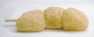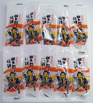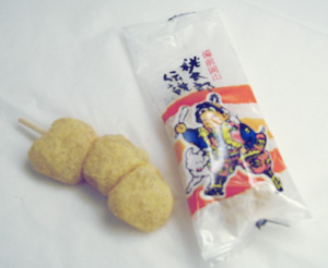 昭和を思わせるようなレトロな包装紙。この桃太郎、幼児に見える。おまけにワガママそうな顔。「ボクちゃん、鬼たいじ行くんだもんね。偉いでちょ。」とアテレコをしておこう。 家来は犬だけらしい。それもタレ目で気の弱そうな犬。「桃太郎ちゃん、ボク行かないよう。臆病な犬だと言われてもいい・・・」とアテよう。 小さなだんごが3つ串に刺してある串団子。1個ずつ分包されているので便利がいい。小袋にも、パッケージと同じ絵がプリントしてあるが、印刷品質の問題か、細かいところまで再現できていない。 やわらかさ:モチモチ 甘さ:甘さ控えめ 色:きなこ色 香り:きなこの香り 水分少なめ、きなこも少なめ、サックリした歯ごたえ。 だんご自体は白くなく、黄色で不透明。 これと言った特徴の無い味で万人受け。 きびだんごは、中に具(?)が入らない形が主流なので、串団子のようにだんご1個のサイズが小さいほうが食べやすいかも。 分けやすいし、職場などへのお土産にはGOOD。